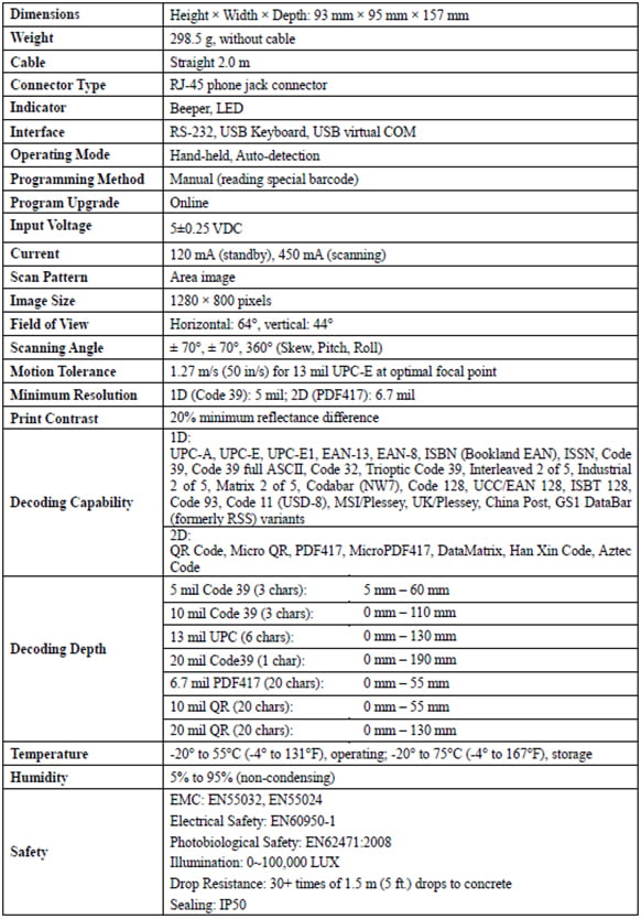- Green aimer, bicolour LED indicator and loud sound deliver comfortable and convenient scanning experience