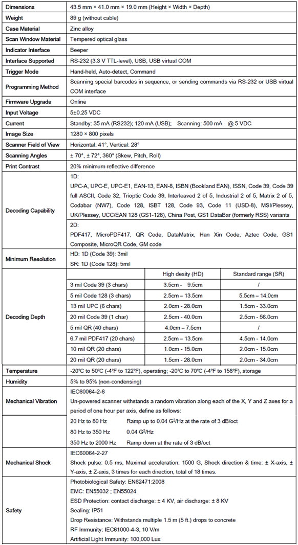 - Advanced image induction technology ensures rapid induction of barcodes, even through a transparent lens in front of the scanning window